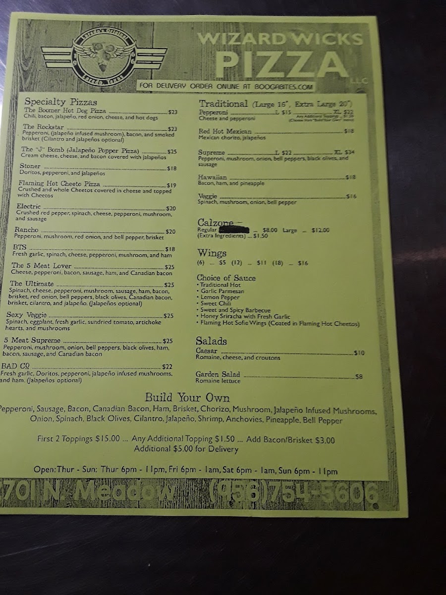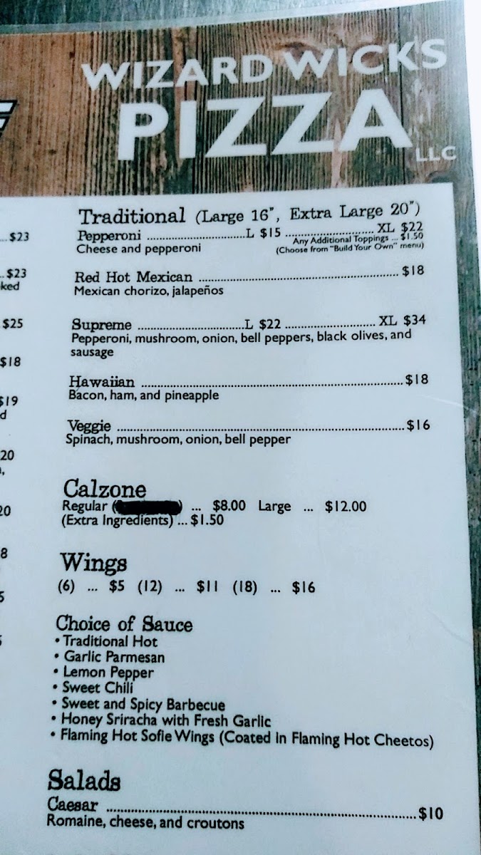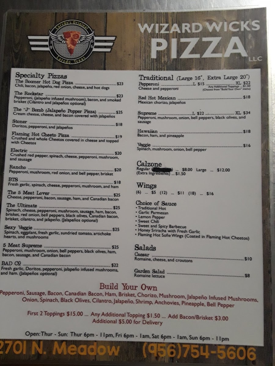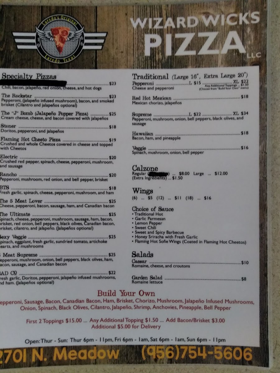Welcome to Wizard Wicks Pizza (Laredo's Original), a culinary gem located at 2701 N Meadow Ave, Laredo, TX. Dive into a vibrant menu that showcases their renowned calzones, ranging from small options perfect for 1-2 people to large servings ideal for group sharing. Don’t miss their enticing salads, including the classic Caesar and a refreshing Garden Salad, perfect for pairing with your meal.